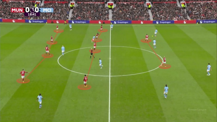卡里克就不一样,他给中卫减负了。不让他们干“前跳”这种高风险活儿了。踢曼城时,曼联是靠锋线球员回追来补位。看下面这球,罗德里找到防线间的福登,但多尔古从左中场一路狂飙回防,把漏洞堵上了。
